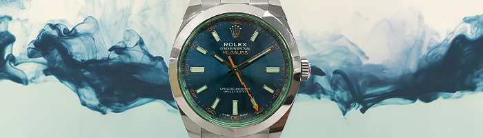 これは、緑色に着色されたサファイアガラスで、ミルガウスにのみ採用されている特別な仕様です。通常のサファイアクリスタルと比べても、その透明感と深みのある色合いが際立ちます。