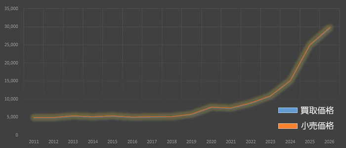 金貨の価格は金相場の動向に左右されるため、一定の金額を示すのは容易ではありません。2026年1月29日時点では、金1グラムあたりの小売価格が29,815円(税込)、買取価格が29,568円(税込)と、いずれも高水準にあります。
