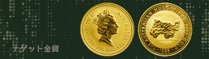 「ナゲット金貨」は、オーストラリア・パース造幣局により、1986年から1989年まで発行されていた地金型金貨です。表面にはエリザベス二世の肖像、裏面には金塊がレリーフされているのが特徴です。