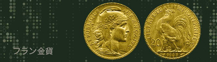 「フラン金貨」は、フランス革命時代にパリ造幣局で発行された金貨です。年代ごとに人物や意匠が異なり、それぞれのデザインに歴史の趣を感じられます。