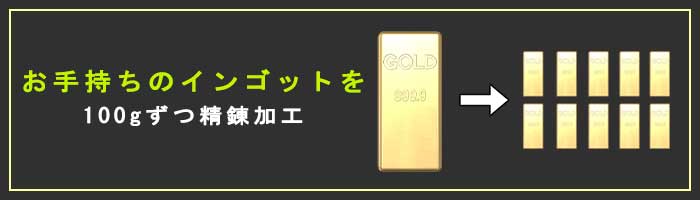 金のインゴットについて調べていると「インゴット精錬加工行います」こんなサイトを見たことがあるのではないでしょうか。目を疑うような怪しい内容ですが、じつはしっかりとしたサービスです。主に日本マテリアルで行われているインゴット精錬加工は1㎏のインゴットを100gのインゴット10個に分割したり、その他にも様々な重さのインゴットを小さなインゴットに分割するサービスです。