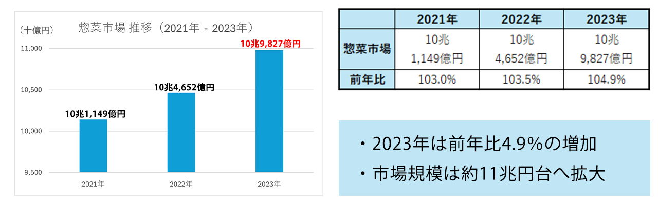 「2024幎 版惣菜癜曞 惣菜垂堎動向」によるず、䞭食惣菜垂堎芏暡は2021幎から2023幎にかけお順調に成長しおおり、垂堎の拡倧が明確に瀺されおいたす。
