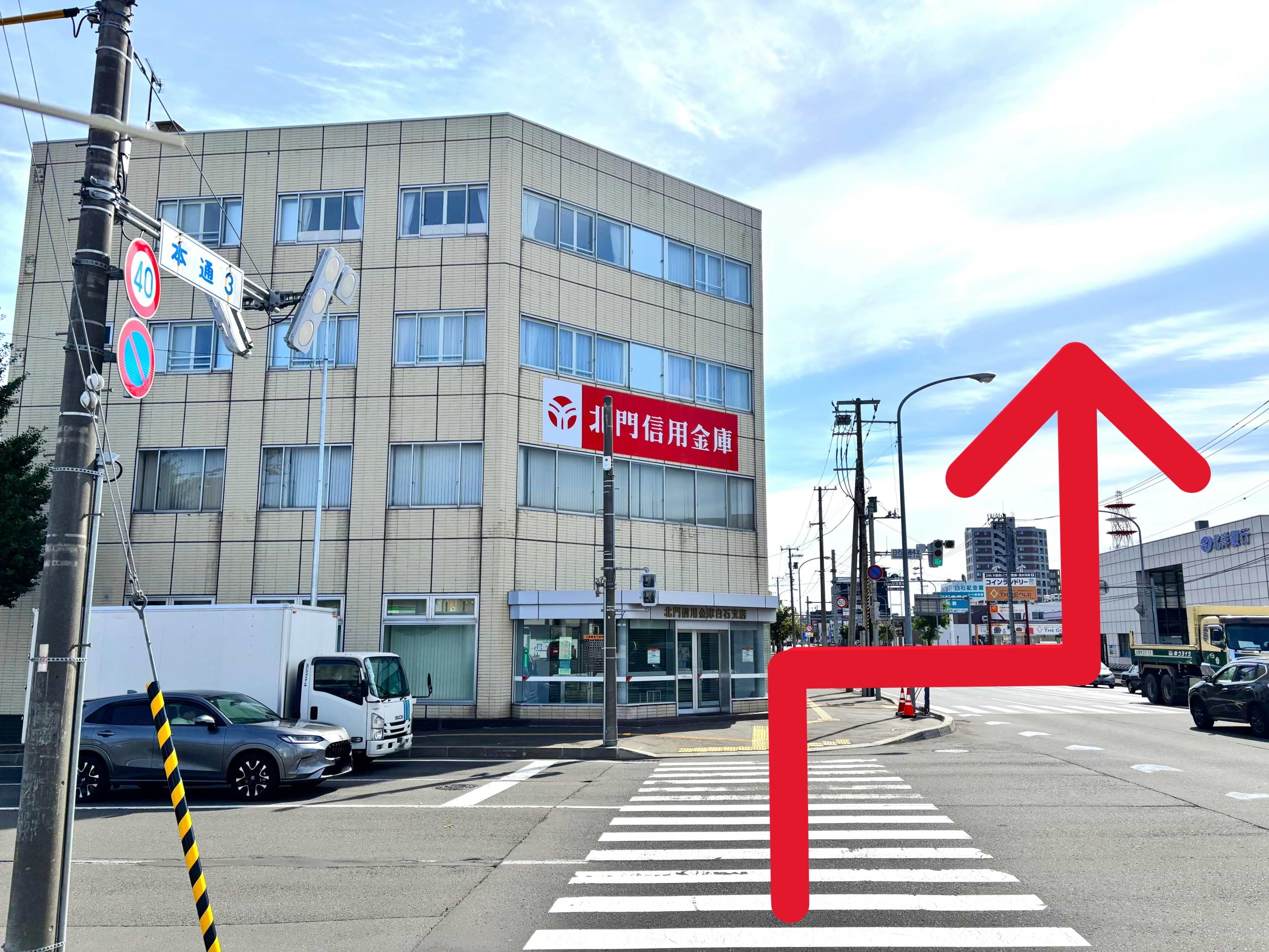北門信用金庫 白石支店を左手に白石本通3交差点を渡り、国道12号線沿いをさらに250mほど直進すると右手に当店がございます