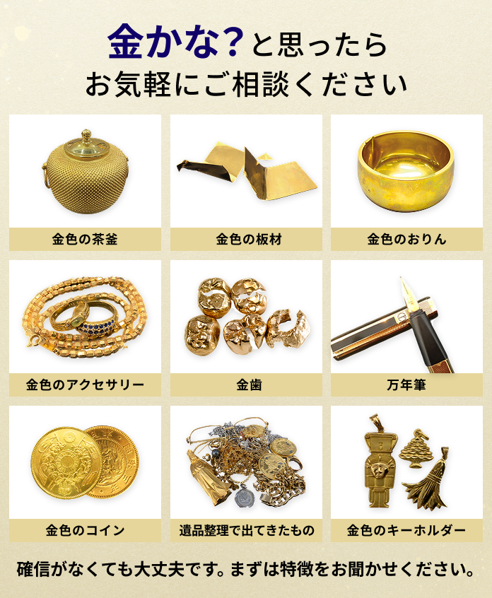 はい、査定できます。お客様の大切なお品物が金製品かどうかをプロの鑑定員が一点一点丁寧に確認させていただきますのでご安心ください。本物かどうかに関わらず当店にて無料でお調べいたします。お気軽にご来店ください。